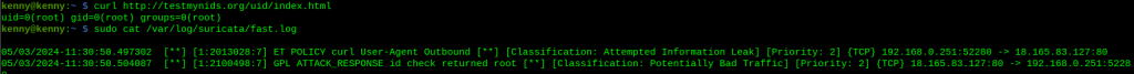 Wow that is a big number of rules! Now with the Suricata rules enabled, I ran the same pre-test command to trigger alerts: