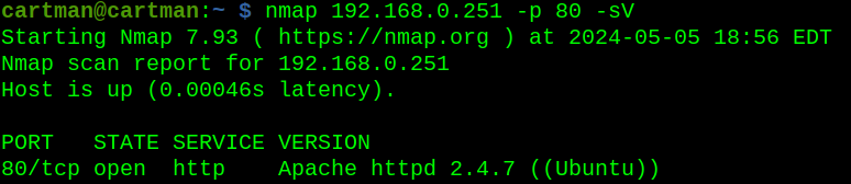 sudo nmap -vvv 192.168.0.251 -sT -p 80 -sC