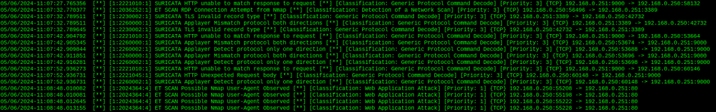 Now that we have our testing environment set up, we can finally start throwing some basic nmap scans against it. With our simple Suricata rule we created in local.rules, the alert will only show if a connection is made, and nothing else. I’ll demo more advanced rules afterwards: