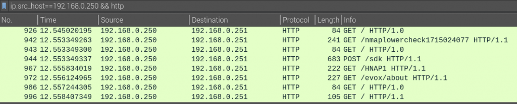 What returns in Wireshark is just a handful of traffic packets. Within here, I need to discover what triggers the IDS rule. It does not take long to see that nmap uses it own User-Agent value: