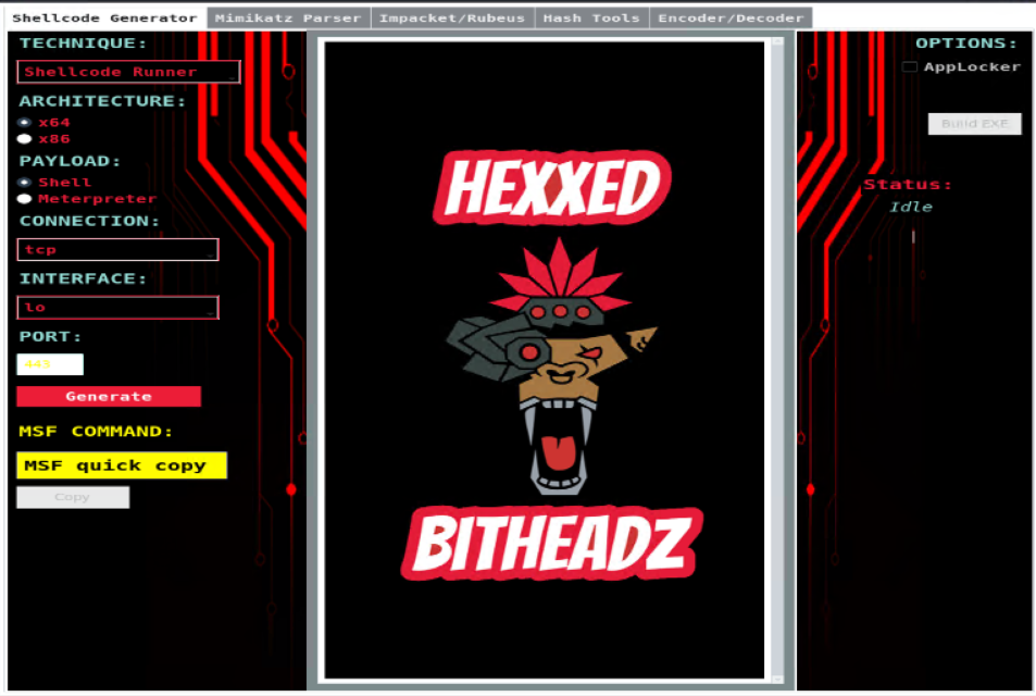 To demo one real quick, we’ll select Process Injection, in the left pane we’ll confirm the target architecture, payload preference, connection type, interface, and port, then hit Generate. The source code will appear in the middle pane after a few seconds. Then we’ll select the AppLocker checkbox on the right pane; this will dynamically modify the code so the exe behaves differently. What does that mean? Well, it will be set to uninstall versus instead that running normally. NEAT! Finally, we’ll hit Build EXE, deliver the file, and run it. By default the exe file will  look for explorer.exe and injects into that process.