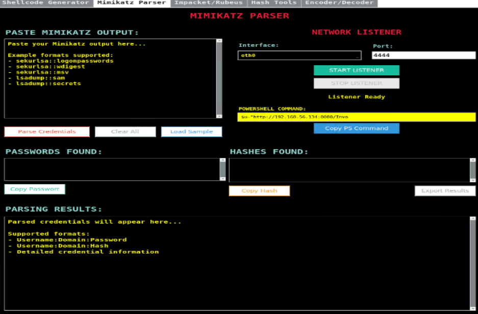 We loved this idea, and it got kinda fancy: paste the Mimikatz output, and this would parse usernames / passwords / hashes out for you. We were even figuring out how to set up a listener and have Mimikatz just feed the results to the listener, so you wouldn’t have to worry about saving to disk or having to copy all that nonsense 😊.