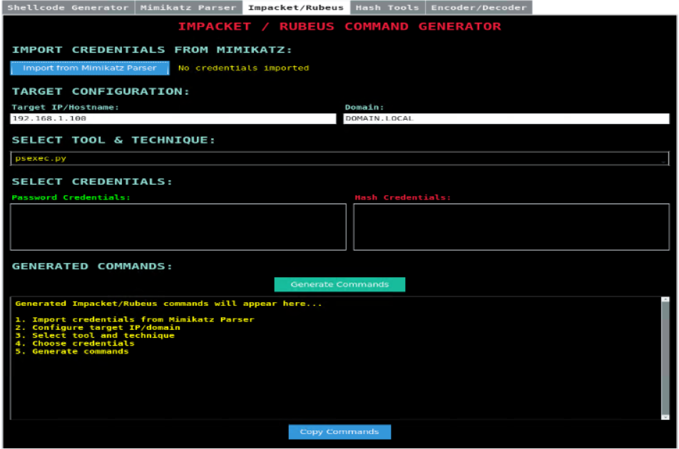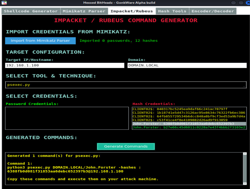 Once we click the Import from Mimikatz Parser button, the credentials will auto-populate. From there we select the Impacket tool we will use, then GonkWare will generate the exact command, next is copy, paste in the terminal and run. In the screenshot below we imported a file that contained 12 hashes, picked psexec.py selected a user and hash, clicked Generate Commands , and voilà the ready-to-run command appears.